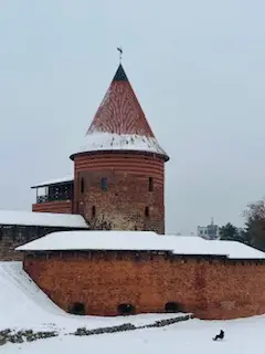 Just a little further on from the square (we did a little detour down to the river, which was quite spectacularly frozen), is the Castle of Kaunas. If I’m honest, it’s really just a turret but, it’s still worth a visit. We didn’t pay to go in, so there may be more of it to see on the inside. While we were there, people were sledging down the hill, but in summer, open-air concerts are held there, which I imagine are rather atmospheric.